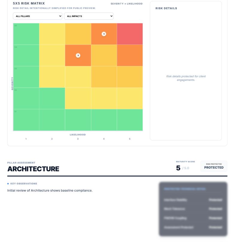 Pillar-by-pillar assessment of maturity, exposure, and scale-critical gaps.